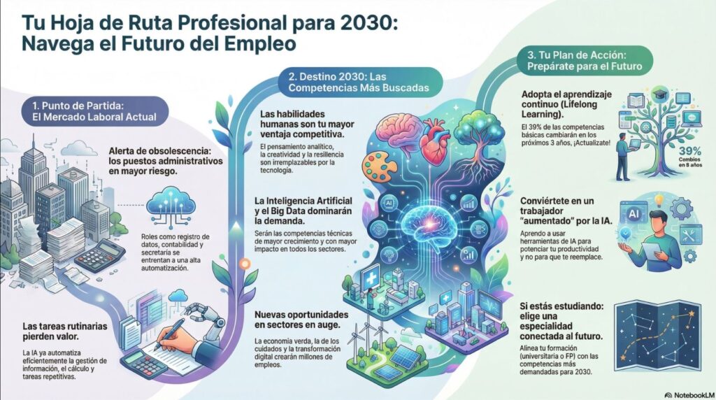 Fórmate. Todos jugamos un número en la lotería del desempleo alguna vez en la vida y, puede tocarnos. España concentra el 72,3 % del paro registrado en el sector servicios. Y, precisamente, ese es el mismo sector que la IA amenaza con automatizar masivamente en los próximos años. La transición no es opcional: es urgente. Según el Future of Jobs Report 2025 del WEF, estas son las claves de lo que viene: 📉 LOS PUESTOS EN PELIGRO (Y POR QUÉ) En España, los roles administrativos y de oficina son los más vulnerables. Se prevé una caída masiva en: ❌ Asistentes administrativos y secretarios (-29%). ❌ Empleados de registro de datos (-27%). ❌ Contabilidad y nóminas (-24%). La razón: Se espera que para 2027, el 34% de las tareas rutinarias (procesamiento de datos, cálculo básico) se automaticen. 🏗️ LA EXCEPCIÓN: HOSTELERÍA Y CONSTRUCCIÓN Curiosamente, aunque sufren alta rotación, los robots aún tienen limitaciones «altas» para sustituir la destreza manual compleja. 🚀 LA SOLUCIÓN: UNA ESTRATEGIA A TRES BANDAS Para mitigar este impacto y aprovechar los 170 millones de nuevos empleos que se crearán globalmente, necesitamos actuar ya: 1️⃣ Administración Pública: La prioridad debe ser la financiación del Reskilling. El 64% de las empresas en España ve esto como la medida política más efectiva. Necesitamos agilidad educativa en competencias STEM y apoyo a los colectivos vulnerables (+45 años). 2️⃣ Empresas: La «escasez de talento» es la barrera nº1. La solución no es despedir, sino la Movilidad Interna: recualificar a administrativos para roles en auge (como gestión de datos). 💡 Dato clave: Apoyar el bienestar de los empleados es ahora la práctica nº1 para asegurar talento, por encima de la promoción. 3️⃣ Profesionales: El 39% de tus competencias básicas cambiarán en 5 años. Tu refugio ante la automatización son las Habilidades Humanas: ✅ Pensamiento analítico y creativo. ✅ Resiliencia y flexibilidad. ✅ Alfabetización en IA (aprende a usarla, no a temerla). El futuro no va de que los robots nos quiten el trabajo, sino de cerrar la brecha entre las capacidades actuales y las nuevas demandas. Fuente: INE, SEPE, Ministerio de Trabajo y Economía Social, Ministerio de Inclusión, Seguridad Social y Migraciones, Ministerio de Educación y Formación Profesional (MEFP), Ministerio de Economía, Comercio y Empresa (MINECO), ONTSI, Banco de España, OIT (ILO), Eurostat, Comisión Europea, OCDE, FMI, Banco Mundial, OMC, UNESCO, Cedefop, EIGE, UNECE, Foro Económico Mundial (WEF), DigitalES, CaixaBank Dualiza, Orkestra-Instituto Vasco de Competitividad, Randstad Research, Confederación Canaria de Empresarios, Fundación FOESSA, Fundación BBVA-IVIE, Fundación Universia, Fundae, SEPIE, IFR, AEDIPE, Bankinter, Educaweb, InfoJobs, LinkedIn, Indeed, Coursera, ADP Research, Job Market Insights y Reddit. hashtag#FutureOfJobs hashtag#IA hashtag#Reskilling hashtag#RecursosHumanos hashtag#EmpleoEspaña hashtag#TransformacionDigital hashtag#Talento