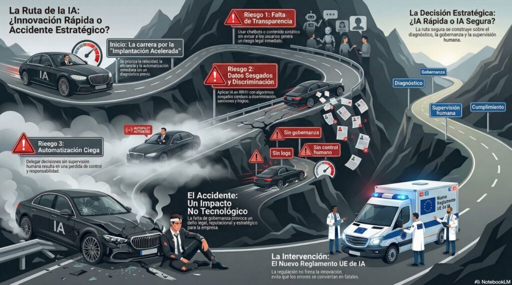 Con la Inteligencia Artificial ocurre exactamente lo mismo. Si en tu “bebida enegértica inteligente” mezclas prisa, automatización y falta de control 🍸⚡, la decisión no será estratégica… será errónea. ⚠️ Al principio todo parece ir bien: 🚗 velocidad, ⚡ eficiencia, 🤖 automatización. La llamada implantación acelerada resulta tentadora. Pero cuando la IA se implanta sin diagnóstico, sin gobernanza y sin supervisión, el camino empieza a torcerse. Primero aparecen los riesgos ⚠️ 🔴 Falta de transparencia en chatbots y contenido sintético 🔴 Datos sesgados en RRHH que derivan en discriminación 🔴 Automatización ciega sin control humano Luego llegan las señales claras de peligro 🚧 ❌ Sin gobernanza ❌ Sin logs ❌ Sin control humano Y cuando nadie frena a tiempo, el impacto no es tecnológico. Es legal, reputacional y estratégico 💥⚖️📉 Aquí es donde entra el Nuevo Reglamento Europeo de IA 🚑🇪🇺 No para frenar la innovación, sino para evitar que el accidente sea irreversible. La alternativa existe: 🛣️ una ruta más lenta, pero segura 📋 diagnóstico 🏛️ gobernanza 👁️ supervisión humana ✅ cumplimiento Porque al final la decisión no es técnica. Es estratégica. ¿IA rápida… o IA segura? La diferencia entre una y otra puede decidir el futuro de tu empresa. Soy Joaquín Rieta, formador y consultor en Inteligencia Artificial para CEOs y equipos directivos 🤝🧠. Ayudo a empresas a implantar IA con método, gobernanza y visión estratégica 📊🧭. www.joaquinrieta.com hashtag#IA hashtag#CEO hashtag#GobernanzaIA hashtag#ReglamentoUEIA hashtag#Liderazgo hashtag#EstrategiaEmpresarial hashtag#Compliance